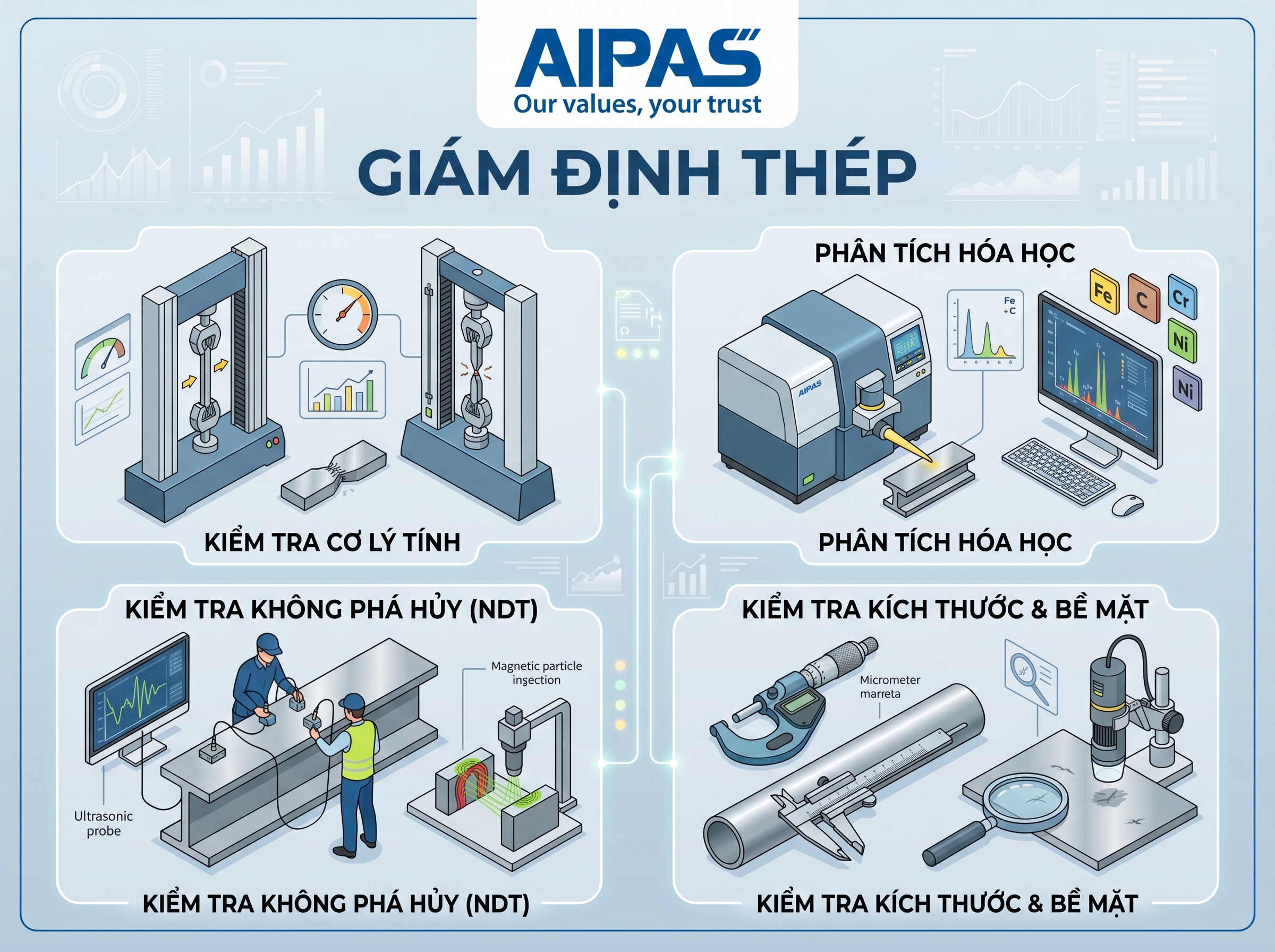Giám định thép là quá trình kiểm tra, đánh giá chất lượng sản phẩm thép thông qua các phương pháp khoa học nhằm đảm bảo đáp ứng tiêu chuẩn kỹ thuật và quy chuẩn quốc gia.