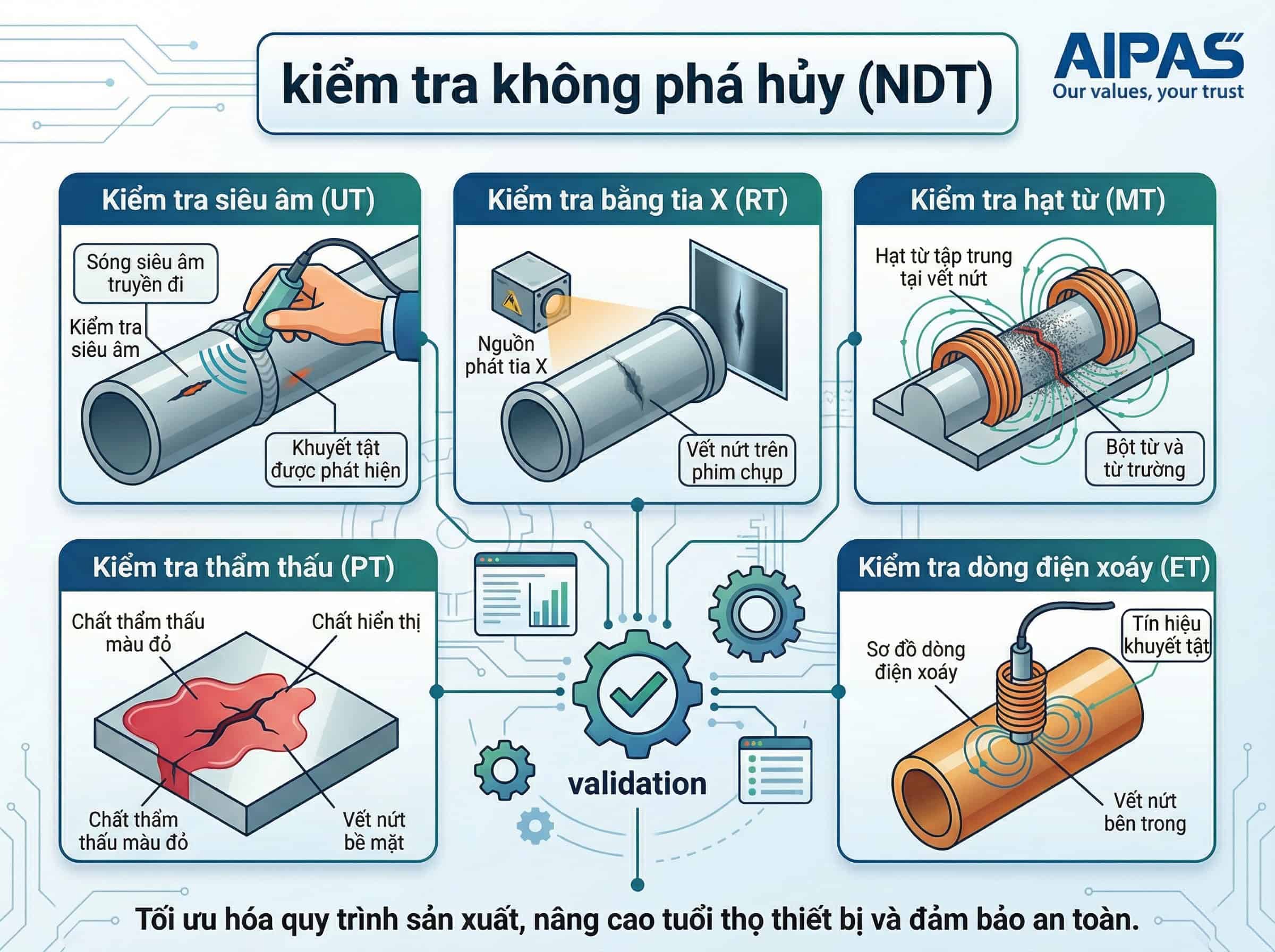 Kiểm tra không phá hủy (NDT – Non-Destructive Testing) là phương pháp kiểm tra, phát hiện khuyết tật bên trong hoặc bề mặt vật liệu, mối hàn mà không làm hư hỏng đối tượng kiểm tra. Đây là tiêu chuẩn bắt buộc trong các ngành dầu khí, xây dựng, hàng không và năng lượng tại Việt Nam.